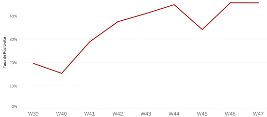 30 novembre 2022 : (dernières données disponibles) Données calculées depuis le premier cas confirmé (3 octobre 2022) Total des cas suspects : 12,541 cas +15 ()en 24h (précédent : +293 en 24h ) Total des cas confirmés : 1,110 cas +28 (+2,58%) en 24h, (précédent : +22 en 24h) Total des cas suspects hospitalisés : 10,591 cas +7 () en 24h, (précédent +162 en 24h) Total des décès : 233 décès (157 institutionnels et 76 communautaires) +3 décès (1,28%) en 24h, (précédent : +2 décès en 24h). Bilan partiel du choléra en Haïti selon les données de la Direction d’Épidémiologie, des Laboratoires et de la Recherche du Ministère de la Santé publique. Taux de positivité hebdomadaire :