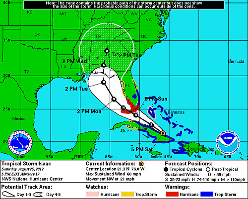 À 17h00, le centre ISACC est localisé à 21.3N 76.0W, à 312 km au Nord-Ouest d'Haïti, il longe la côte Nord de Cuba en direction du Sud de la Floride, bien que son centre s'éloigne d'Haïti d'heure en heure, la prudence reste de rigueur. Le Centre national de météorologie (CNM) informe que le niveau rouge est maintenu, et que les bandes périphériques constituées par des grosses cellules nuageuses convectives, très intenses et dangereuses d'ISAAC restent et demeurent sur Haïti cet après-midi en dépit de l'éloignement progressif de son centre. Des fortes pluies, des vents et orages violents associés à ces masses nuageuses convectives sont par conséquent toujours possibles à l'échelle du pays cet après-midi et ce soir. Une amélioration graduelle de la situation est prévue pour demain. Le Président de la République, Michel Martelly, et la Première Dame, Mme Sophia Martelly, demande à la population de continuer à faire preuve de prudence. La Présidence demande particulièrement aux personnes des zones à risques de rester vigilantes et d'appliquer scrupuleusement les consignes de sécurité. Le Président de la République adresse "ses félicitations aux différents acteurs impliqués dans la gestion de cet évènement, et les invite à rester toujours déterminés en vue de secourir les personnes nécessiteuses," annonçant qu'un train de mesures a été adopté par la Présidence pour venir en aide aux familles haïtiennes. Sur le terrain À Bainet, les plantation de bananes, cocotiers, avocats etc... ont été affectées par les inondations, tandis que les récoltes d’oranges et d'haricots et de petit mil sont compromises. De nombreux habitants ont perdus leur biens. La ville de Marigo dans le Sud-Est a été inondée. La rivière Massacre à Cayes-Jacmel est sortie de son lit. 64 maisons ont été affectées à Belladère selon la DPC. Dans la commune de Thomassique l'on rapporte des pertes de bétail. À Ganthier 50 maisons ont été totalement détruites, une dizaine partiellement, et des pertes de bétails. De nombreuses plantations sont perdues dans le Plateau central.
