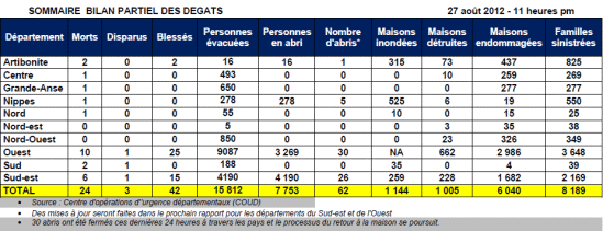La DPC informe que le nouveau bilan du passage d'Isaac sur Haïti est de 24 victimes, 3 disparus, 42 blessés, 15,812 personnes évacuées, 7,753 personnes qui sont toujours réparties dans 62 abris, 1,144 maisons inondées, 1,005 détruites, 6,040 endommagées et 8,189 familles sinistrées. Concernant les victimes la DPC a donnée plus d'informations sur ces dernières : Ouest Une fille âgée de 8 ans à Thomazeau (Ouest) est décédée dans l'effondrement d’un mur de sa maison, dont des rafales ont emporté la toiture auparavant. Un garçon âgé de 6 ans de Carrefour (Ouest) a été victime d'une chute d’arbre sur sa tente. Un garçon âgé entre 10 et 12 ans à Ganthier (Ouest) a été emporté par les eaux. Son corps, emporté par les eaux, a été retrouvé, mais n'a pas encore été identifié (constat fait par un juge de paix en présence du Maire). Un homme âgé de 60 ans à Kenscoff (Ouest) a été victime d'un glissement de terrain à Nouvelle Touraine. Une fille âgée de 12 ans à Kenscoff (Ouest) a également perdue la vie dans un glissement de terrain à Nouvelle Touraine. Un garçon âgé de 8 ans de Cornillon (Ouest) a été victime suite à l'effondrement d’un mur de sa maison, à la 1re section Plaine Céleste. Un garçon âgé de 8 ans de Cornillon (Ouest) est décédé suite à l'effondrement d’un mur de sa maison, à l'Etang, 2e section Genipailler. Un homme âgé 22 ans à Cornillon (Ouest) a été victime suite à l'effondrement d'une maison au marché de la 2e section Boucan Bois-Pin. Un homme âgé de 35 ans à Léogâne (Ouest) a été emporté par les eaux, son corps a été retrouvé sur la côte à Lasalle, 2e section Petite. La victime est originaire de Nan Mapou, 3e section de Grande Rivière. Un homme adulte de l'Arcahaie (Ouest) a été victime de la chute d’un arbre sur la toiture de sa maison. Artibonite Un garçon âgé de 7 des Gonaïves (Artibonite), a été électrocuté près de sa maison à Pravil, à cause d'un fil électrique d'une connexion clandestine. Ce décès est lié aux forts vents. Un homme adulte originaire de Saint-Marc (Artibonite), a perdu la vie après la chute d’un arbre. Centre Une dame adulte à Cerca-la-Source (Centre), est décédée sous une tente qui a été emportée par les forts vents. Grand-Anse Une fille âgée de 7 ans à Pestel (Grande-Anse) a été victime de la chute d’arbre sur sa tente. Nippes Un homme adulte vivant à Paillant (Nippes) a été emporté par les eaux sauvages alors qu’il se rendait au pâturage. Nord Un homme adulte à Dondon (Nord) a perdu la vie dans un glissement de terrain dans un jardin. Sud Un homme adulte à Port-à-Piment (Sud) est décédé après la chute d’un arbre suit aux forts vents, à Rendel, 1re section communale. Un homme âgé de 80 ans à Roche-à-bateaux (Sud) a été électrocuté. Sud-est : Une dame de 51 ans de Marigot (Sud-Est) est décédée suite à la chute d’arbre sur sa maison. Une dame de 70 ans de Bainet (Sud-est) est décédée dans la 1re section communale Brésilienne suite à l'effondrement de sa maison. Un garçon de 10 ans à Belle-Anse (Sud-est) a été victime d'un éboulement dans la localité d'Anse-à-Boeuf. Ce décès est lié aux fortes pluies. Un homme de 47 ans de Belle-Anse (Sud-est) a été heurté par un projectile (objet volant) suite à des coups de vents dans la localité Ravine Palme, Baie d’Orange. Un homme âgé de 50 ans à Jacmel (Sud-est) est décédé après la chute d’un arbre à Fond Melon, 2e Section Communale de Jacmel. Un homme de 60 ans de Jacmel (Sud-est) a perdu la vie à Cochon Gras, dans l’effondrement de sa maison.