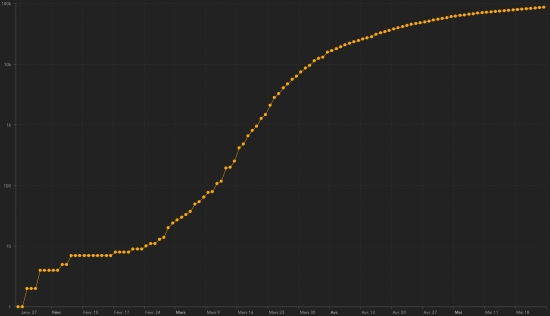 France : Cases since the start of the epidemic : 182,709 cases +673 in 24 hours (the day before: +21) Active cases : (excluding death and recovery) 89,604 cases -226 (the day before: +19). Death : 28,348 deaths since the start of the epidemic +35 (the day before: +43) Healings : 64,608 people +70 in 24 hours (the day before +338) Graph: Trend of propagation