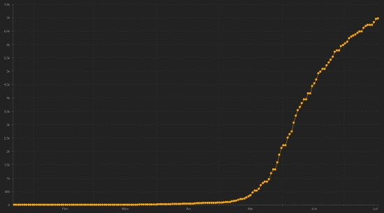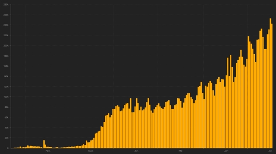 TOP 5 of the countries with the most active cases : 1st - USA: 2,401,245 cases (+53,819 in 24h), the day before (+61,330) 2nd - Brazil: 539.957 cases (+2.025 in 24 hours) the day before (+14.198) 3rd - India: 359,060 cases (+16,587 in 24 hours), the day before (+11,298) 4th - United Kingdom: 248,083 cases (+574 in 24h), the day before (+564) 5th - Russia: 206,078 cases (-1,350 in 24h), the day before (-1,463) TOP 5 of the countries with the most deaths : 1st - USA: 139,266 deaths (+907 in 24h), the day before (+939) 2nd - Brazil: 77,851 deaths (+1,163 in 24 hours), the day before (+1,322) 3rd - United Kingdom 45,318 deaths (+114 in 24 hours), the day before (+66) 4th - Mexico: 38,310 deaths (+736 in 24 hours), the day before (+668) 5th - Italy: 35,028 deaths (+3 in 24 hours), the day before (+20) DIASPORA : United States : Cases since the start of the epidemic : 3,647,715 cases (+71,285 in 24 hours), the day before (+77,032) Healings : 1,107,204 people (+16,559 in 24h), the day before (+14,763) National Healing Rate : 30.35% (-) Death : 139,266 deaths (+907 in 24h), the day before (+939) Active cases (minus deaths and cures): 2,401,245 cases (+53,819 in 24 hours), the day before (+61,330) Canada : Cases since the start of the epidemic : 111,559 cases (+415 in 24h), the day before (+451) Healings : 98,281 people (new method of calculating the authorities) National Healing Rate : 88.10% (+) Death : 8,884 deaths (+9 in 24 hours), the day before (+18) National mortality rate : 7.96% (-) Active cases : (excluding death and recovery) 4,394 active cases France : Cases confirmed since the first case : 211.943 (+841), previous (+534) Healings : 79,233 people (+208 in 24h), previous (+216) National Healing Rate : 37.38% (-) Death : 30,132 deaths (+14 in 24 hours), previous (+18) Active cases : (excluding death and recovery) 102,588 (+629), previous (+300) Latin America and the Caribbean active cases : Brazil : 539,957 cases (+2,025 in 24h) the day before (+14,198) Peru : 98,756 cases (+779 in 24h), the day before (-957) Colombia : 95,215 cases (+7,946 in 24h), the day before (+2,146) Argentina : 67,343 cases (+3,792 in 24h), the day before (+1,753) Ecuador : 35,790 cases (+892 in 48 hours), the day before (+368) Mexico : 28,786 cases (update not available), the day before (+425) Dominican Republic : 24,748 cases (+654 in 24h), the day before (+811) Chile : 24,302 cases (+3,195 in 24 hours), the day before (-1,270) advance by one place Panama : 23,850 (+319 in 24h), the day before (+375) French Guiana : 5,662 cases (+69 in 24h), the day before (+51) Haiti : 3,091 cases (-106 in 24h), the day before (-76) Martinique : 150 cases (unchanged) Jamaica : 80 cases (-28), the day before (-3) Guadeloupe : 93 cases (unchanged) Cuba : 57 cases (-11 in 24 hours), the day before (+4) Bahamas : 27 cases (+5), the day before (+3) HAITI : Epidemiological situation : According to the Ministry of Public Health, 27 new cases of Covid-19 have been confirmed in Haiti (previous: +46 in 24 hours), for a total of 6,975 cases throughout the national territory (40.70% women and 59.30% since the first case (March 19, 2020 https://www.haitilibre.com/en/news-30319-haiti-health-origin-of-the-first-2-cases-of-covid-19-in-haiti.html ). Deaths : 1 new death was recorded in the department of Grand’Anse bringing the national total to 146. Healings :: 3,738 people (+132), the day before (+122) Cure rate : 53.59% Active cases : (less death and recovery) 3,091 cases (-106 in 24 hours), the day before (-76) Imported cases : 106 cases (updated information not available) +49 cases between July 1 (reopening of airports) and the report of July 9 https://www.haitilibre.com/en/news-31239-haiti-covid-19-daily-report-july-9-2020.html . It should be noted that since July 9 https://www.haitilibre.com/en/news-31239-haiti-covid-19-daily-report-july-9-2020.html . the Ministry of communication no longer any data on the number and origin of imported cases which was on this date of 109 cases (last explanations of the Ministry on imported cases July 7 https://www.haitilibre.com/en/news-31207-haiti-flash-explanation-of-the-ministry-on-the-number-of-imported-cases.html Community cases (since March 19) : updated information not available since the report of July 9: 6,380 cases ( https://www.haitilibre.com/en/news-31239-haiti-covid-19-daily-report-july-9-2020.html ) Number of suspected cases investigated since March 19 : 16,300 cases (+180 in 24 hours), the day before (+460) Number of cases tested since the start of the pandemic : 15,557 (as of July 15) People currently hospitalized : (information not available) Home quarantine currently : (information not available) Graph *: daily confirmed cases