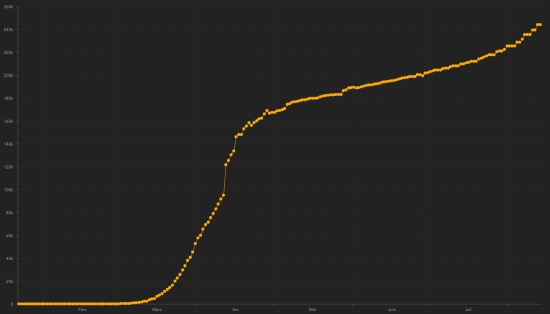Warning : The Haitian health authorities having "omitted" 18 times to update the number of cases ... Consequently this graph represents a situation overall more positive than reality . Suspected cases investigated since March 19 : 20,733 cases (+166 in 24 hours), previous (+67) Cases tested since the start of the pandemic : 20,119 (+231 tests in 24 hours as of August 11) People currently hospitalized : (information not available) People in intensive care currently : (information not available) People in home quarantine currently : (information not available) Cases confirmed by department : West: 5,483 cases (+16), the day before: (+27) Artibonitis: 459 cases (+5) Center: 387 cases (+1), the day before: (+2) North: 379 cases (unchanged), the day before: (+2) Southeast: 224 cases (+1), the day before: (+3) South: 212 cases (unchanged) Northeast: 192 cases (+1) North-West: 184 cases (unchanged), the day before: (+2) Grand'Anse: 158 cases (+1), the day before: (+1) Nippes: 132 cases (+4), the day before: (+1) Location of cases : West : 5,483 cases (+16) Delmas : 1,336 cases Port-au-Prince : 1,114 Pétion-ville : 817 cases Tabarre : 666 cases Croix-des-Bouquets : 527 Carrefour : 415 cases Petit-Goâve : 144 cases Cité Soleil : 92 cases Cabaret : 72 cases (unchanged) Léogâne : 69 cases Kenskoff : 57 cases (unchanged) Gressier 43 cases (unchanged) Archaie : 39 cases Anse à Galet : 35 cases (unchanged) Grand Goâve : 14 cases (unchanged) Cornillon : 13 cases (unchanged) Ganthier : 12 cases (unchanged) Thomazeau : 9 cases (unchanged) Fonds-Verettes : 6 (unchanged) Pointe à Raquette : 3 cases (unchanged) Artibonite : 459 cases (+5) Saint Marc : 157 cases (+4) Verettes : 111 case (unchanged) Gonaïves : 102 cases (unchanged) Gros Morne : 18 cases (unchanged) Marchand Dessalines : 16 cases (unchanged) Petite Rivière de l’Artibonite : 14 cases (unchanged) L’Estère : 9 cases (unchanged) Saint Michel : 9 cases (+1) Desdunes : 6 cases (unchanged) Marmelade : 6 cases (unchanged) Ennery : 4 cases (unchanged) Grande Saline : 3 cases (unchanged) La Chappelle : 2 cases (unchanged) Anse Rouge : 2 cases (unchanged) Center : 387 cases (+1) Mirebalais : 148 cases (+2), the day before : (+2) Hinche : 133 cases (+1) Boucan Carré : 30 cases (unchanged) Lascaobas : 25 cases (unchanged) Belladère : 18 cases (unchanged) Thomonde : 12 cases (unchanged) Savanette : 6 cases (unchanged) Saut-d’Eau 5 cases (unchanged) Cerca la Source : 4 cases (unchanged) Maissade : 3 cases (unchanged) Cerca Cavajal : 2 cases (unchanged) Thomassique : 1 case (unchanged) North : 379 cases (unchanged) Cap Haïtien : 233 cases (unchanged), the day before : (+1) Limbé : 29 cases (unchanged) Pignon : 18 cases (unchanged), the day before : (+1) Grande Rivière du Nord : 14 cases (unchanged) Milot : 13 cases (unchanged) Plaine du Nord : 11 case (unchanged) Borgne : 11 case (unchanged) Limonade : 10 cases (unchanged) Plaisance du Nord : 9 cases (unchanged) Quartier Morin : 8 cases (unchanged) Pilate : 8 cases (unchanged), the day before : (+1) Acul du Nord : 5 cases (unchanged) Port Margot : 5 cases (unchanged) Dondon : 3 cases (unchanged) Bahon : 1 case (unchanged) Saint Raphaël : 1 case (unchanged) South-East : 224 cases (+1) Jacmel : 169 cases (+1), the day before : (+1) Côte-de-Fer : 14 cases (unchanged) Bainet : 13 cases (unchanged) Vallée de Jacmel : 7 cases (unchanged) Thiotte : 7 cases (unchanged) Marigot : 5 cases (unchanged) Belle Anse : 4 cases ((unchanged), the day before : (+1) Cayes Jacmel : 3 cases ((unchanged), the day before : (+1) Anse-à-Pitre : 2 cases (unchanged) South : 212 cases (unchanged) Cayes : 121 case (unchanged) Aquin : 21 case (unchanged) Saint-Louis du Sud : 11 case (unchanged) Les Anglais : 10 cases (unchanged) Port-Salut : 8 cases (unchanged) Torbeck : 7 cases (unchanged) Chardonnières : 6 cases (unchanged) Camp-Perrin : 6 cases (unchanged) Port à Piment : 5 cases (unchanged) Tiburon : 4 cases (unchanged) Coteaux : 3 cases (unchanged) Chantal : 2 cases (unchanged) Île-à Vache : 2 cases (unchanged) St Jean du Sud : 2 cases (unchanged) Cavaillon 2 cases (unchanged) Roche à Bateau : 1 case (unchanged) Maniche : 1 case (unchanged) Norh-East : 192 cases (+1) Ouanaminthe : 60 cases (+1) Caracol 37 cases (unchanged) Trou du Nord : 28 cases (unchanged) Fort Liberté : 25 cases (unchanged) Mombin Crochu 18 cases (unchanged) Terrier Rouge : 7 cases (unchanged) Perches : 5 cases (unchanged) Mont Organisé : 5 cases (unchanged) Ferrier : 2 cases (unchanged) Carice : 2 cases (unchanged) Capotille : 2 cases (unchanged) Ste-Suzanne : 1 case (unchanged) North-West : 184 cases (unchanged) Port de Paix : 110 cases (unchanged), the day before : (+2) Saint-louis du Nord : 21 case (unchanged) Bombardopolis : 13 cases (unchanged) Môle Saint-Nicolas : 12 cases (unchanged) Jean Rabel : 11 case (unchanged) Bassin Bleu : 5 cases (unchanged) Chansolme : 4 cases (unchanged) La Tortue : 4 cases (unchanged) Baie de Henne 2 cases (unchanged) Anse-à-Foleur : 2 cases (unchanged) Grand'Anse : 158 cases (+1) Jérémie : 125 cases (+1), the day before : (+1) Anse d’Hainault : 16 (unchanged) Chambellan : 7 cases (unchanged) Dame Marie : 3 cases (unchanged) Pestel : 2 cases (unchanged) Irois : 2 cases (unchanged) Bonbon : 1 case (unchanged) Moron : 1 case (unchanged) Roseaux : 1 case (unchanged) Nippes : 132 cases (+4) Miragoâne : 63 cases (+4) Fond des Nègres : 20 cases (unchanged), the day before : (+1) Baradères : 12 cases (unchanged) Anse à Veau 7 cases (unchanged) Petite Riviere de Nippes : 6 cases (unchanged) Plaisance du Sud : 6 cases (unchanged) Petit Trou de Nippes : 6 cases (unchanged), the day before : (+1) L’Asile : 5 cases (unchanged) Paillant : 4 cases (unchanged) Arnaud : 2 cases (unchanged) Grand Boucan : 1 case (unchanged) NOTE : "unchanged" means that there is no new data available: it may be no new cases, unreported or incomplete cases or delay in transmission data at the Ministry ... Distribution o