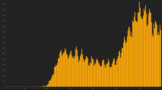 New York State : Cases since the start of the epidemic : 423,440 cases (+737 in 24 hours), the day before (+700) Healings : 73,907 people (+65 in 24 hours), the day before (+63) Death : 32,805 deaths (+8 in 24 hours) the day before (+10) Death rate : 7.75% (-) Active cases (less deaths and cures): 316,728 cases (+664 in 24 hours), the day before (+627) Tests : 6,816,381 people tested (+87,900 in 24 hours), the day before (+87,776) New York City : Cases since the start of the epidemic : 229,167 cases (+438 in 24 hours), the day before (+386) Death : 23,610 deaths (+8 in 24 hours), the day before (+10) Death rate : + 10.30% (-) State of Massachusetts : Cases since the start of the epidemic : 122,319 cases (+612 in 48h), previous (+392) Death : 8,790 deaths (+39 in 48h), previous (+6) Death rate : 7.19% (=) Tests : 1,389,980 people tested (+27,879 in 24), previous (+15,757) Florida : Cases since the start of the epidemic (March 1, 2020) : 557,137 cases (+6,236 cases in 24 hours), the day before (+8,109) Deaths : 8,913 deaths (+148 in 24 hours), the day before (+212) Mortality rate : 1.60% (+) Tests : 4,230,763 people tested (+143,184 in 24 hours), the day before (+38,304) Miami Dade (FL) : Cases since the start of the epidemic : 140,984 cases (+1,713 in 24 hours), the day before (6,141) Deaths : 1,954 deaths (+15 in 24 hours), the day before (+30) Death rate : 1.39% (=) QUEBEC : Epidemiological situation : Cases confirmed since the first case (February 27, 2020) : 60,917 cases (+104 in 24 hours), the day before (+95) Healing : 53,441 people (+171 in 24 hours), the day before (+135) Death : 5,715 deaths (+6 in 24 hours), the day before (+12) Active cases : (excluding death and cures) 1,761 cases (-73 in 24 hours), the day before (-52) Hospitals : 149 people hospitalized (-2 in 24 hours) Intensive care : 23 people (+3 in 24 hours), the day before (+1) In Montreal, epicenter of the pandemic in Quebec where the largest Haitian community is located (nearly 150,000 members): 29,364 cases have been confirmed since the start of the epidemic (+47 in 24 hours) the day before (+40). TOP 5 of the most contaminated Montreal boroughs : 1 - Montreal North: 2,638 cases (+2 in 24 hours), the day before (unchanged in 24 hours) 2 - Mercier – Hochelaga-Maisonneuve: 2,463 cases (+4 in 24 hours), the day before (+2) 3 - Ahuntsic-Cartierville: 2.458 (+10 in 24 hours), the day before (+1) 4 - Côte-des-Neiges – Notre-Dame-de-Grâce: 2,334 cases (+6 in 24 hours), the day before (+8) 5 - Rivière-des-Prairies – Pointe-aux-Trembles: 2,227 cases (+3 in 24 hours), the day before (+4) TOP 5 of the most contaminated regions of Quebec : 1 - Montreal: 29,364 cases (+47 in 24 hours), the day before (+40) 2 - Montérégie: 9,104 cases (+11 in 24 hours), previous: (+7) 3 - Laval: 6,170 cases (+18 in 24 hours), previous: (+11) 4 - Lanaudière: 4,662 (+12 in 24h), previous: (+11) 5 - Laurentians: 4,085 cases (+7 in 24h), previous: (+10) Province of Quebec Healing Rate : 87.73% (+) Death rate : 9.38% (-) DOMINICAN REPUBLIC : Epidemiological situation : Cases confirmed since March 1 :: 83,134 cases (+910 in 24 hours), the day before (+1,130). First case (March 1, 2020) https://www.haitilibre.com/en/news-30165-haiti-flash-first-case-of-covid-19-in-the-dominican-republic.html Healings : 47,946 healings (+851 in 24h), the day before (+1,429) Death : 1,393 since March 1 (+22 in 24 hours), the day before +25) active cases : (excluding death and recovery) 33,795 cases (+ 37 in 24 hours), the day before (-324) DR: Number of daily confirmed cases