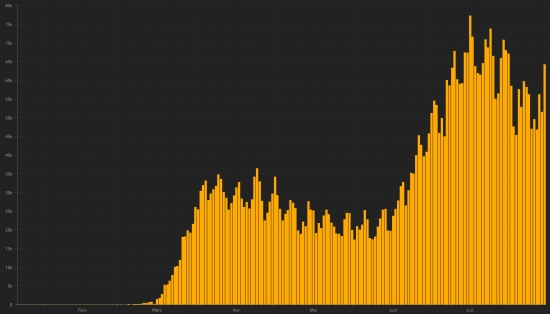 Average cure rate in the world : 62.62% (+) Average death rate in the world : 3.62% (-) TOP 5 countries with the most active cases : 1st - USA: 3,348,682 cases (+36,376 in 24 hours), the day before (+36,181) 2nd - India: 667,950 cases (+6,355 in 24 hours), the day before (+7,973) 3rd - Brazil: 503,972 cases (-94,341 update delayed healings) 4th - United Kingdom: 267,349 cases (+19 in 24 hours), the day before (+12) 5th - Russia: 172,328 cases (-1,510 in 24 hours), the day before (-1,637) TOP 5 countries with the most deaths : 1st - USA: 168,446 deaths (+1,204 in 24 hours), the day before (+1,215) 2nd - Brazil: 105,490 deaths (+27 in 24 hours), the day before (+1,262) 3rd - Mexico: 55,908 deaths (+615 in 24 hours), the day before (+627) 4th - India: 49,036 (+996 in 24 hours), the day before (+1,007) 5th - UK 46,791 deaths (update not available) TOP 5 countries with the highest number of healings : (New) 1st - Brazil: 2,616,981 (+95,881 in 24h), cure rate (81.11%) 2nd - India: 1,808,936 (+57,381 in 24h), cure rate 71.61%) ahead of one place 3rd - USA: 1,796,326 (+21,678 in 24 hours), cure rate 33.81%) 4th - Russia: 727,895 (+6,422 in 24h), cure rate 79.92%) 5th - South Africa: 461,734 (+ 24,117 in 24h), cure rate 79.73%) DIASPORA : United States : Cases since the start of the epidemic : 5,313,454 cases (+59,258 in 24 hours), the day before (+56,819) Healings : 1,796,326 people (+21,678 in 24 hours), the day before (+19,423) National Healing Rate : 33.81% (+) Death : 168,446 deaths (+1,204 in 24 hours), the day before (+1,215) Active cases (less deaths and cures): 3,348,682 cases (+36,376 in 24 hours), the day before (+36,181) Canada : Cases since the start of the epidemic : 123,605 cases (+421 in 24 hours), the day before (+481) Healings : 109,657 people (+397 in 24 hours), the day before (+431) National Healing Rate : 88.72% (+) Death : 9,068 deaths (+5 in 24 hours), the day before (+11) National death rate : 7.34% (-) Active cases : (excluding death and recovery) 4,880 cases (+19 in 24 hours), the day before (+39) France : Confirmed cases since the first case : 249,492 (+2.846 in 24h), previous (+2.669) Healings : 83,836 people (+185 in 24 hours), previous (+190) National Healing Rate : 33.60% (-) Deaths : 30,396 deaths (+18 in 24 hours), previous (+17) Active cases : (excluding death and recovery) 135.260 (+2.643 in 24 hours), previous (+2.462) Latin America and the Caribbean active cases : Brazil : 503,972 cases (-94,341 update delayed cures) the day before (+47,756) Colombia : 169,326 cases (-4840 in 24 hours), the day before (+5,269) Peru : 136,208 cases (-28,118 in 24 hours), the day before (+28,916) Argentina : 77,905 (-371 in 24 hours), the day before (+2,198) Mexico : 44,982 cases (+1,107 in 24 hours), the day before (+1,343) Dominican Republic : 33,540 cases (-255 in 24 hours), the day before (+37) Panama : 24,782 (+268 in 24 hours), the day before (+437) Chile : 16,734 cases (+130 in 24 hours), the day before (+60) Ecuador : 14,203 cases (+757 in 24 hours), the day before (+1,207) French Guyana : 7,125 cases (-16 in 24 hours), the day before (-26) Haiti : 2,400 (-95 in 24 hours), the day before: (+29) Bahamas : 964 cases (+28), the day before (+37) Cuba : 594 cases (+34 in 24 hours), the day before (+24) Jamaica : 307 cases (+4), the day before (+5) Guadeloupe : 344 cases (+79 in 24 hours), the day before (+50) Martinique : 223 cases (unchanged) HAITI : Epidemiological situation : According to the Ministry of Public Health, 21 new cases of Covid-19 would have been confirmed in Haiti within 24 hours the day before (+29), for a total of 7.831 cases throughout the national territory (41.56% of women and 58.44% ) since the first case (March 19, 2020 https://www.haitilibre.com/en/news-30319-haiti-health-origin-of-the-first-2-cases-of-covid-19-in-haiti.html ). Deaths : 4 new deaths from Covid-19 were recorded in 24 hours, 3 in the West department 1 in the Artibonite department, bringing the national total to 196 Healings :: 5,235 people (+112 in 72h), previous (+141 in 48h) Healing rate : 66.85% (+) Active cases : (less deaths and cures) 2,400 (-95 in 24 hours), the day before: (+29) Imported cases : 152 cases since the reopening of airports and +43 since the last report dated July 9 (109) https://www.haitilibre.com/article-31348-haiti-flash-152 -cas-imported-from-the-reopening-of-aeroports.html (update not available) Suspected cases investigated since March 19 : 20,862 cases (+129 in 24 hours), previous (+166) Cases tested since the start of the pandemic : 20,624 (+505 tests in 24 hours as of August 11), the day before (+231) People currently hospitalized : (information not available) People in intensive care currently : (information not available) People currently in home quarantine : (information not available) Cases confirmed by department : West: 5,495 cases (+12), the day before: (+16) Artibonite: 459 cases (unchanged), the day before: (+5) Center: 387 cases (unchanged), the day before: (+1) North: 385 cases (+6) Southeast: 225 cases (+1), the day before: (+1) South: 212 cases (unchanged) Northeast: 193 cases (+1), the day before: (+1) Northwest: 184 cases (unchanged) Grand'Anse: 159 cases (+1), the day before: (+1) Nippes: 132 cases (unchanged), the day before: (+4) Location of cases : West : 5,495 cases (+12) Delmas : 1,336 cases (unchanged) Port-au-Prince : 1,114 (+2 ) Pétion-ville : 818 cases (+1) Tabarre : 666 cases (unchanged) Croix-des-Bouquets : 530 (+3) Carrefour : 417 cases (+2) Petit-Goâve : 147 cases (+3) Cité Soleil : 92 cases (unchanged) Cabaret : 72 cases (unchanged) Léogâne : 69 cases (unchanged) Kenskoff : 57 cases (unchanged) Gressier 40 cases (+1) Archaie : 43 cases (unchanged) Anse à Galet : 35 cases (unchanged) Grand Goâve : 14 cases (unchanged) Cornillon : 13 cases (unchanged) Ganthier : 12 cases (unchanged) Thomazeau : 9 cases (unchanged) Fonds-Verettes : 6 (unchanged) Pointe à Raquette : 3 cases (unchanged) Artibonite : 459 cases (unchanged) Sain