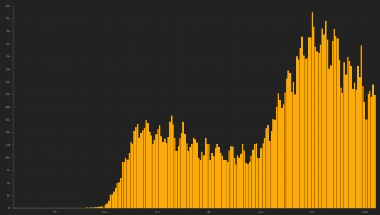 Note that the progression of the Covid-19 pandemic at the global level has been in a plateau phase since July 22 and seems to be starting to decline slightly ... Average cure rate in the world : 64.33% (+) Average death rate in the world : 3.47% (-) TOP 5 countries with the most active cases : 1st - USA: 3,506,399 cases (+22,874 in 24 hours), the day before (+29,520) 2nd - India: 707,668 cases (+10,338 in 24 hours), the day before (+5,300) 3rd - Brazil: 554,146 cases (-9,268 in 24 hours), the day before (+18,061) 4th - United Kingdom: 283,539 cases (+1,311 in 24 hours), the day before (+1,058) 5th - Spain: 206,840 (enters the Top 5) TOP 5 countries with the most deaths : 1st - USA: 176,362 deaths (+953 in 24 hours), the day before (+1,126) 2nd - Brazil: 114,250 deaths (+892 in 24 hours), the day before (+1,054) 3rd - Mexico: 60,254 deaths (+644 in 24 hours), the day before (+504) 4th - India: 56,706 (+912 in 24 hours), the day before (+945) 5th - United Kingdom 41.509 (+18 in 24 hours), the day before (+2) TOP 5 countries with the highest total number of healings : 1st - Brazil: 2,913,966 (+58,408 in 24h), cure rate 81.34% (-) 2nd - India: 2,280,566 (+57,989 in 24h), cure rate 74.90% (+) 3rd - USA: 1,985,484 people (+20,428 in 24 hours) cure rate 35.03% (+) 4th - Russia: 768,906 (+ 3,152 in 24h), cure rate 80.57% (-) 5th - South Africa: 504,127 (+4,025 in 24h), cure rate 83.05% (+) DIASPORA : United States : Cases since the start of the epidemic : 5,668,245 cases (+44,255 in 24 hours), the day before (+48,667) Healings : 1,985,484 people (+20,428 in 24 hours), the day before (+18,021) National Healing Rate : 35.03% (+) Deaths : 176,362 deaths (+953 in 24 hours), the day before (+1,126) Active cases (less deaths and recoveries): 3,506,399 cases (+22,874 in 24 hours), the day before (+29,520) Canada : Cases since the start of the epidemic : 126,560 cases (+241 in 24 hours), the day before (+694) Healings : 112,621 people (+240 in 24 hours), the day before (+570) National Healing Rate : 88.99% (+) Death : 9,117 deaths (+7 in 24 hours), the day before (+13) National death rate : 7.20% (-) Active cases : (excluding death and recovery) 4,822 cases (-6 in 24 hours), the day before (+411) France : Confirmed cases since the first case : 275,235 (+3,602 in 24 hours), previous (+4,586) Healings : 84,923 people (+121 in 24 hours), previous (+187) National Healing Rate : 31.26% (-) Death : 30,495 deaths (+8 in 24h), previous (+23) Active cases : (excluding death and recovery) 159,817 (3,473 in 24h), previous (+4,376) Latin America and the Caribbean active cases : Brazil : 554,146 cases (-9,268 in 24 hours), the day before (+18,061) Peru : 168,092 cases (+8,797 in 24 hours), the day before (+8,439) Colombia : 156.630 (-1.782 in 24 hours), the day before (-1.489) update not available Argentina : 84.173 (+1.666 in 24 hours), the day before (+1.791) Mexico : 42,858 cases (+1,078 in 24 hours), the day before (-138) Dominican Republic : 28,997 cases (-205 in 24 hours), the day before (-569) Panama : 23,074 (+263 in 24 hours), the day before (-26) Chile : 15,186 cases (+37 in 24 hours), the day before (+34) Ecuador : 12,923 cases (+420 in 24 hours), the day before (+855) French Guiana : 7,331 cases (+5 in 24 hours), the day before (+13) Haiti : 2,497 (+34 in 24h), the day before: (+19) (update not available) Bahamas : 1,509 cases (+54), the day before (+79) Cuba : 522 (-20 in 24 hours), the day before (-41) Jamaica : 580 cases (+38), the day before (+55) Guadeloupe : 666 cases (unchanged in 24 hours), the day before (+259 in 48 hours) Martinique : 221 cases (unchanged in 24 hours) HAITI : Epidemiological situation : NOTICE : The Ministry of Public Health, for an unknown reason has not been able for almost a week to publish the figures of the situation in Haiti as before, to be inserted in our general report of 11:00 am. In order not to penalize the Haitian diaspora in the world, the 11:00 am report is now published earlier without the situation in Haiti. A special bulletin will be published for Haiti during the day, depending on the availability of information from the Ministry of Public Health. Should the situation recover in the future, we will include the situation in Haiti in the general bulletin. [HL] Situation in Haiti the day before : https://www.haitilibre.com/article-31608-haiti-covid-19-forte-hausse-des-cas-confirmes-et-suspects-en- 24h.html UNITED STATES : Epidemiological situation : United States : Cases since the start of the epidemic : 5,668,245 cases (+44,255 in 24 hours), the day before (+48,667) Healings : 1,985,484 people (+20,428 in 24 hours), the day before (+18,021) National Healing Rate : 35.03% (+) Deaths : 176,362 deaths (+953 in 24 hours), the day before (+1,126) National death rate : 3.11% (-) Active cases (less deaths and recoveries): 3,506,399 cases (+22,874 in 24 hours), the day before (+29,520) Tests : 71,560,771 people were tested (+757,261 in 24 hours) the day before (+771,584) USA: Number of daily confirmed cases