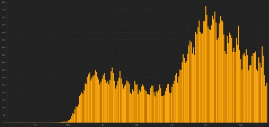 New downward trend in the number of new cases for 4 days. Average cure rate in the world : 67.25% (+) Average death rate in the world : 3.25% (-) TOP 5 countries with the most active cases : 1st - USA: 3,779,260 cases (+705 in 24 hours), the day before (+6,486) 2nd - India: 897,394 cases (+13,697 in 24 hours), the day before (+1,155) 3rd - Brazil: 462,188 cases (-9,445 in 24 hours), the day before (-17,083) 4th - Spain: 354.543 (+8.886 in 24h), previous (+26.462 in 48h) 5th - United Kingdom: 311,430 cases (+2,446 in 24 hours), the day before (+2,948) TOP 5 countries with the most deaths : 1st - USA: 189,680 deaths (+465 in 24 hours), the day before (+274) 2nd - Brazil: 127,464 deaths (+504 in 24 hours), the day before (+310) 3rd - India: 73,890 deaths (+1,115 in 24 hours), the day before (+1,133) 4th - Mexico: 68,484 deaths (+703 in 24 hours), the day before (+223) 5th - United Kingdom 41,675 deaths (+32 in 24 hours), the day before (+3) TOP 5 countries with the highest total number of healings : 1st - Brazil: 3,572,421 (+23,220 in 24h), cure rate 85.83% (+) 2nd - India: 3,398,844 (+74,894 in 24h), cure rate 77.77% (+) 3rd - USA: 2,359,111 people (+25,560 in 24 hours), cure rate 37.28% (+) 4th - Russia: 854,069 (+6,323 in 24h), cure rate 82.32% (-) 5th - South Africa: 567,729 (+1,174 in 24h), cure rate 88.65% (+) DIASPORA : USA : Cases since the start of the epidemic : 6,328,051 cases (+26,730 in 24 hours), the day before (+24,316) Healings : 2,359,111 people (+25,560 in 24 hours), the day before (+17,556) National Healing Rate : 37.28% (+) Deaths : 189,680 deaths (+465 in 24 hours), the day before (+274) Active cases (less deaths and recoveries): 3,779,260 cases (+705 in 24 hours), the day before (+6,486) Canada : Cases since the start of the epidemic : 135,757 cases (+1,462 in 24 hours), the day before (+405) Healings : 119,420 people (+1,034 in 24 hours), the day before (+194) National Healing Rate : 87.97% (-) Death : 9.203 deaths (+7 in 24 hours), the day before (+2) National death rate : 6.78% (-) Active cases : (excluding death and recovery) 7,134 cases (+421 in 24 hours), the day before (+209) Canada: Number of daily confirmed cases