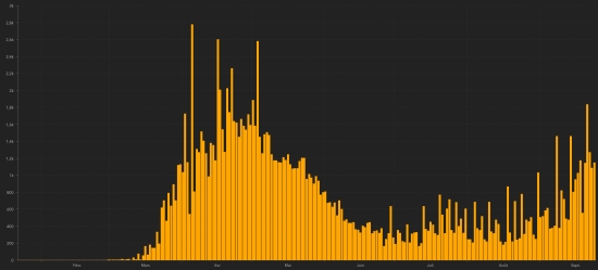 Canada has passed the 150,000 case mark since the start of the epidemic. However, the number of deaths remains low and the number of healings high. In Quebec, the number of cases continues to increase, especially in Montreal and worries the health authorities. France: Confirmed cases since the first case: 530,996 (+16,096 in 24h), previous (+13,072) Healings: 94,383 people (+431 in 24 hours), the day before (+444) National Healing Rate: 17.77% (-) Deaths: 31,431 deaths (+52 in 24 hours), the day before (+43 Active cases: (excluding death and recovery) 405,182 (+15,613 in 24 hours), The day before (+9,411) Latin America and the Caribbean active cases: Brazil: Brazil: 414,940 cases (+8,508 in 24 hours), the day before (-29,996) Argentina: 126.911 (+1.974 in 24 hours), the day before (+3.943) Peru: 114,336 cases (update not available), previous (+5,904 in 48h) Colombia: 103,800 (+6,555 in 24 hours), the day before (-4,921) Mexico: 34,222 cases (+736 in 24 hours), the day before (+1,524) Dominican Republic: 24,028 cases (-201 in 24 hours), the day before (-235) Panama: 20,935 (-327 in 24 hours), the day before (-419) Ecuador: 17,081 cases (+1,212 in 24 hours), the day before (+2,204) Chile: 12,289 cases (-104 in 24 hours), the day before (-633) French Guiana: 8,028 cases (+22 cases in 24 hours), previous (+21) Guadeloupe: 4,196 cases (-25 in 24 hours), previous (+1,034) advance by one place Jamaica: 4,021 cases (+146 in 24 hours), the day before (+124) Haiti: 1,870 (Update not available), previous (-51 in 48h) Bahamas: 1,651 cases (+28 in 24 hours), the day before (+104) Martinique: 1,146 cases (-1 in 24 hours), the day before (+1) Cuba: 579 (+9 in 24 hours), the day before (-29) HAITI: Epidemiological situation: Disclaimer: Once again, the Ministry of Public Health has not been able to make available daily data on the Covid-19 situation in Haiti. Accordingly, the information below on the situation in Haiti is the same as THAT in our EVE BULLETIN. According to the Ministry of Public Health, 22 new cases of Covid-19 in 24 hours would have been confirmed in Haiti as of September 20 and 21, 2020 (latest partial data available) previous (+5 cases in 24 hours ) for a total of 8,646 cases nationwide since the first case (March 19, 2020 https://www.haitilibre.com/en/news-30319-haiti-health-origin-of-the-first-2-cases-of-covid-19-in-haiti.html ). Deaths: 4 new deaths were reported within 48 hours, 3 in the Center Department and 1 in the West Department. National total: 225 Healings: : 6,551 people (69 in 48h), previous (+119 in 72h) Healing rate: 75.77% (+) Active cases: (less deaths and recoveries) 1,870 (-51 in 48h) Imported cases: 152 cases since the reopening of airports and +43 since the last report dated July 9 (109) https://www.haitilibre.com/en/news-31348-haiti-flash-152-cases-imported-since-the-reopening-of-airports.html (Since then, this information is no longer made available) Suspicious cases investigated since March 19: 27,266 (+368 in 48 hours as of September 21) Cases tested since the start of the pandemic: 26,975 (+196 in 48 hours as of September 21) People currently hospitalized: (information not available) People in intensive care currently: (information not available) People currently treated at home: (information not available) People in isolation: (information not available) Cases confirmed by department: West: 5.851 (+15) North: 544 (+2) Artibonite: 518 (unchanged) Center: 448 (+1) North-East: 278 (+3) South East: 265 (+1) South 233: (unchanged) Northwest 201: (unchanged) Grand'Anse 167: (unchanged) Nippes 141: (unchanged) Location of cases: Ouest : 5,851 case (+15) Delmas : 1,419 cases (+) Port-au-Prince : 1,149 cases (+) Pétion-ville : 913 cases Tabarre : 691cas (+) Croix-des-Bouquets : 584 cases (+) Carrefour : 442 cases Petit-Goâve : 148 cases Cité Soleil : 94 cases Léogâne : 81 case (+) Cabaret : 77 cases (+) Kenskoff : 60 cases Archaie : 48 cases (+) Gressier 45 cases Anse à Galet : 37 cases Cornillon : 16 cases Grand Goâve : 16 cases Ganthier : 13 cases Thomazeau : 9 cases Fonds-Verettes : 6 cases Pointe à Raquette : 3 cases Nord : 544 cases (+2) Cap Haïtien : 321 case (+) Limbé : 44 cases Pignon : 22 cases Milot : 22 cases Plaisance du Nord : 17 cases Plaine du Nord : 17 cases Grande Rivière du Nord : 17 cases Borgne : 16 cases Pilate : 15 cases Quartier Morin : 14 cases (+) Port Margot : 12 cases Limonade : 12 cases Acul du Nord : 8 cases Dondon : 3 cases Bahon : 2 cases Saint Raphaël : 2 cases Artibonite : 518 cases (unchanged) Saint Marc : 167 cases Verettes : 125 cases Gonaïves : 116 cases Gros Morne : 23 cases Petite Rivière de l’Artibonite : 20 cases Marchand Dessalines : 16 cases Saint Michel : 13 cases L’Estère : 12 cases Desdunes : 7 cases Marmelade : 6 cases Ennery : 6 cases Grande Saline : 3 cases La Chappelle : 2 cases Anse Rouge : 2 cases Centre : 448 cases (+1) Mirebalais : 161 case (+) Hinche : 158 cases Boucan Carré : 31 case Lascaobas : 30 cases Belladère : 22 cases Thomonde : 15 cases Saut-d’Eau 7 cases Savanette : 6 cases Cerca la Source : 6 cases Maissade : 5 cases Cerca Cavajal : 4 cases Thomassique : 3 cases Nord-Est : 278 (+3) Ouanaminthe : 87 cases (+) Caracol : 45 cases Fort Liberté : 40 cases (+) Trou du Nord : 37 cases Mombin Crochu 21 case Terrier Rouge : 14 cases Mont Organisé : 9 cases Perches : 6 cases Ste-Suzanne : 5 cases Carice : 5 cases Ferrier : 4 cases Capotille : 4 cases Vallière : 1 case Sud-Est : 265 cases (+1) Jacmel : 197 cases Côte-de-Fer : 16 cases (+1) Bainet : 13 cases Thiotte : 10 cases Anse-à-Pitre : 9 cases Vallée de Jacmel : 7 cases Marigot : 7 cases Belle Anse : 4 cases Cayes Jacmel : 2 cases Sud : 233 cases (unchanged) Cayes : 129 cases Aquin : 26 cases Saint-Louis du Sud : 12 cases Les Anglais : 10 cases Port-Salut : 9 cases Port à Piment : 8 cases Torbeck : 7 cases Camp-Perrin : 7 cases Chardonnières : 6 cases Tiburon : 4 cases Coteaux : 4 cases Chantal : 2 cases St Jean du Sud : 2 case