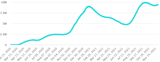4th wave: The total of the 4th wave (beginning of September 20, 2021) amounts to 3,444 confirmed cases and 117 deaths . Cases tested since the start of the pandemic: 139,106 cases (+786 in 48 hours) latest data available. Note that the very low number of people tested does not statistically make it possible to make a representative estimate of the active cases of Covid-19 in Haiti. This also explains the low number of cases detected daily. By comparison, the neighboring Republic has carried out more than 2.4 million tests on its population since the start of the epidemic. TOP 5 most affected municipalities in the West (2021): Delmas: 2.562 (+9); Pétion ville 1,974 (+9); Port-au-Prince 1,357 (+3); Tabarre 1,142 (+5); Croix-des-Bouquets 1,125 (+4) Confirmed cases by department (2021): West: 9,476 cases (2020: 6,945 cases) North: 650 cases (2020: 677 cases) Center: 956 cases (2020: 508 cases) Artibonitis: 777 cases (2020: 593 cases) Northeast: 354 cases (2020: 314 cases) Southeast: 638 cases (2020: 274 cases) South: 677 cases (2020: 262 cases) Northwest: 348 cases (2020: 229 cases) Grand'Anse: 803 cases (2020: 176 cases) Nippes: 221 cases (2020: 149 cases) Cumulative deaths by department (2021): West: 249 deaths (2020: 104 deaths) North: 48 deaths (2020: 34 deaths) Center: 44 deaths (2020: 13 deaths) Artibonitis: 34 deaths (2020: 39 deaths) Northeast: 6 deaths (2020: 6 deaths) South: 46 deaths (2020: 6 deaths) Southeast: 13 deaths (2020: 9 deaths) Northwest: 15 deaths (2020: 12 deaths) Grand'Anse: 7 deaths (2020: 13 deaths) Nippes: 24 deaths (2020: 5 deaths) Distribution of deaths by age (since the start of the epidemic): 0-9 years: 13 deaths 10-19 years: 7 deaths (+1) 20-29 years: 25 deaths 30-39 years: 48 deaths (+1) 40-49 years: 74 deaths 50-59 years: 116 deaths 60-69 years: 168 deaths (+1) 70-79 years: 160 deaths (+1) 80 years and over: 116 deaths Vaccination: 153.182 (+17.926 in 20 days) doses of “Spikevax” vaccine from the MODERNA Laboratory have been injected in total in Haiti since July 16, 2021, date of the first injection. Update November 20, 2021. 68,888 people are fully vaccinated (2 doses). Update 19 November 2021, latest data available. List of 149 vaccination centers open in Haiti (and hours) by department: (update 20 October 2021) DIASPORA: Epidemiological situation: USA: * Case since the first case (March 9, 2020): 49,050,917 cases (+51,180 in 24 hours), the day before (+27,187) * Healings: 38,840,683 healings (+40,697 in 24h), the day before (+12,292) National Healing Rate: 79.18% (=) * Death: 799,138 deaths (+587 in 24 hours), the day before (+306) National death rate: 1.62% (=) * Active cases (less deaths and recoveries): 9,411,096 cases (+9,896 in 24 hours), the day before (+14,589) Test: 748,066,598 (since the 1st case), last data available. USA: Trend of active cases: (less healings and deaths)