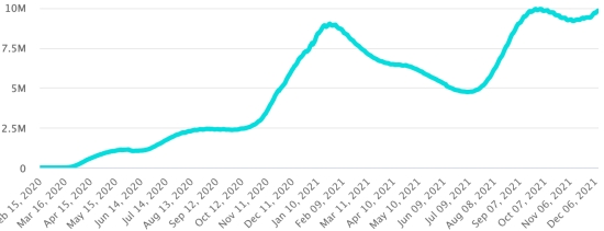 Test: 13,865,594 people tested since the first case (36,489 in 24 hours) Vaccination: 13,863,084 million doses of vaccine injected since December 16, 2020 date of the first injection (+33,799 in 24 hours), latest data available - MSSS dated December 9, 2021) FRANCE: * Cases confirmed since the first case (January 24, 2020): 8,105,785 cases (+ 56,854 cases in 24 hours), the day before (+ 61,340) * Healings: 7,252,376 healings (+20.951 in 24 hours), the day before (+20.194) National Healing Rate: 89.47% (-) Death: 120,168 deaths (+136 in 24 hours), the day before (+133) National death rate: 1.67% (+) * Active cases: (excluding death and cures) 733,241 (+35,767 in 24 hours), the day before (+41,013) France: Trend of active cases: (less healings and deaths)