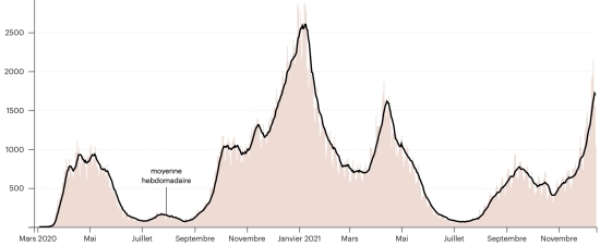 Test: 14,048,253 people tested since the first case (30,836 in 24 hours) Vaccination: 14,032,710 million doses of vaccine injected since December 14, 2020, date of the first injection (+34,001 in 24 hours), latest data available - MSSS dated December 14, 2021) FRANCE: * Cases confirmed since the first case (January 24, 2020): 8,334,133 cases (+63,405 cases in 24 hours), the day before (+12,036) * Healings: 7,362,608 healings (+32,348), the day before (+30,454) National Healing Rate: 88.34% (-) Death: 120,832 deaths (+158 in 24 hours), the day before (not available) National death rate: 1.44% (-) * Active cases: (excluding death and cures) 850,693 (+30,656 in 24 hours), the day before (-18,418) France: Trend of active cases: (less healings and deaths)