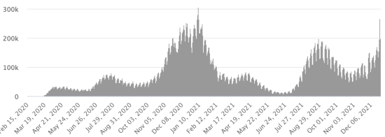 TOP 5 provinces with the most new cases in the last 24 hours: Nacional District: +198 cases (+) Santo Domingo: +118 cases (+) Santiago: +64 cases (-) San Cristóbal: 36 cases (+) La Altagracia: + 17 cases Tests (since the 1st case): 2,550,939 tests (+6,093 in 24 hours), the day before (+7,132) Vaccination: 14.03 million doses of vaccine injected since February 16, 2021, date of the first injection in the Dominican Republic (+20,000 doses injected in 24 hours). Update 23 December 2021 (last available data). QUEBEC: Warning: Center of Expertise and Reference in Public Health informs that due to statutory holidays, daily data on Covid-19 will not be updated on the 24th, 25th and December 26, 2021 and December 31, 2021, January 1 and 2, 2022. Confirmed cases since the first case (February 27, 2020): 521,126 (+10,031 in 24h), previous (+6,361) Healings: 457,630 people (+1,745 in 24 hours), previous (+1,516) Healing rate: 89.53% (-) Death: 11,658 deaths (+6 in 24h), previous (+2) Death rate: 2.28% (-) Active cases: (excluding death and recovery) 41,897 cases (+7,736 in 24h), previous (+4,843) Quebec: Trend of active cases: (less healings and deaths)