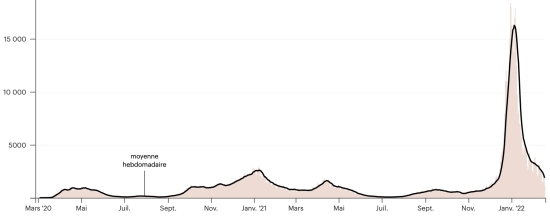 Test: 16,512,862 people tested since the first case (+20,578 in 24 hours) Vaccination: 18,261,836 doses of vaccine injected since December 14, 2020, date of the first injection (+21,772 doses in 24 hours), latest data available - MSSS as of February 17, 2022) FRANCE: *Confirmed cases since the first case (January 24, 2020): 22,068,635 cases (+92,345 cases in 24 hours), previous (+ 98,735) *Healings: 18,340,085 healings (+352,940 in 24h), previous (+391,778) National Cure Rate: 83.10% (+) Deaths: 136,142 deaths (+287 in 24 hours), previous (+276) Death rate: 0.61% (=) Active Cases: 3,592,408 (-260,882 in 24h), previous (-293,709) Test: 240,847,561 (last data available February 12, 2022) France: Trend of active cases: (minus recoveries and deaths)