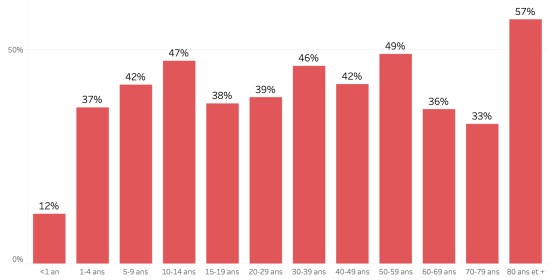 Distribution and deviations of suspected cases, total since October 3 (in 24 hours): Less than 1 year: +200 (+12) 1-4 years: 1,790 cases (+62) 5-9 years: 1,303 cases (+36) 10-14 years: 608 cases (+19) 15-19 years old: 451 cases (+23) 20-29 years old: 1,434 cases (+50) 30-39 years old: 1,435 cases (+45) 40-49 years old: 977 cases (+27) 50-59 years old: 649 cases (+13) 60-69 years old: 387 cases (+8) 70-79 years old: 189 cases (+11) 80 and + () case () Men: 59.53% men (-); women 40.47% (+) Positivity rate by age segment: