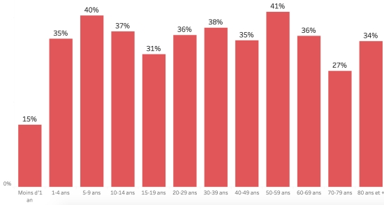 Distribution and deviations of suspected cases, total since October 3: Less than 1 year: + 652 (+16) 1-4 years: 6,640 cases (+189) 5-9 years: 4,848 cases (+115) 10-14 years old: 2,324 cases (+12) 15-19 years old: 1,708 cases (+4) 20-29 years old: 4,470 cases (+18) 30-39 years old: 3,926 cases (+15) 40-49 years old: 2,810 cases (+4) 50-59 years old: 2,121 cases (+60) 60-69 years old: 1,439 cases (+8) 70-79 years old: 766 cases (+2) 80 years and over: 98 cases cases (not available) Men: 55.66% men (-); Women 44.34% (+) Positivity rate by age segment: