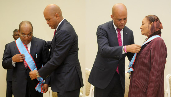 Monday during a ceremony at the National Palace, the President Michel Martelly and his wife Sophia Martelly, in the presence of Ministers Pierre Richard Casimir (Foreign Affairs), Stephanie B. Villedrouin (Tourism), Josette Darguste (Culture), Regine Godfrey (Communication), Councillors of President, personalities from the diplomatic world, of the tourism industry, officials of the public administration, parents and friends of the recipients ; proceeded to the delivery of the Decoration of the Order Honor and Merit, Grade of Grand Cross Plaque Argent to Mrs. Michaële Craan, Consultant to the Office of Tourism South East, and Mr. Fritz N. Cinéas, Ambassador Extraordinary and Plenipotentiary of Haiti in the Dominican Republic.