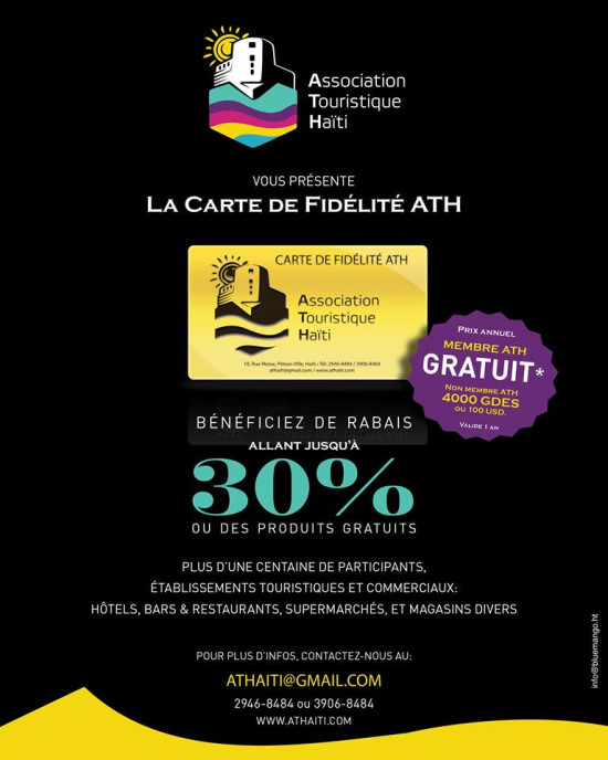 CBC/Welthungerhife, takes into account the planting of fruit and forest trees and their maintenance upstream of the site to reduce erosion directly on the waterfalls, the development and distribution of brochures on biodiversity of the site, training of farmers and guides on agroforestry systems, the nterpretation in several languages of trees and endemic species. The road of Bassin Bleu (5 kms) will be rehabilitated by the Ministry of Public Works. Mission of M.Tourteau Christian in the town of Milot Wednesday, the Northern Regional Director of the Ministry of Tourism, accompanied by several officers, welcomed the Economist Tourteau Christian, Chargé de mission of the Ministry of Tourism for the town of Milot. The objectives of its mission was to meet Mr. Maurice Etienne (owner of Cultural Centre Lakou Lakay) in order to assist him in the development of a Business plan for institution ; meet and talk with the youth of the community to create in them a spirit of creation of "Small Business" on the tourism sector ; study the feasibility of a project of "Briqueterie" in the area for economic improvement of residents. Loyalty Card of the Tourism Association of Haiti Tourism Association of Haiti (ATH) has recently presented its loyalty card, which aims to promote tourism and consumption in tourist facilities in Haiti. According to Ms. Valérie Louis, the cardholders will receive discounts at more than a hundred of tourist establishments in the country, travel agencies, airlines, hotels etc... [up to 30%]. For Richard Buteau, the President of the ATH, this card will allow Haitians who used to spend their holidays abroad to spend their holidays in Haiti while realizing savings in its various trips with the family.